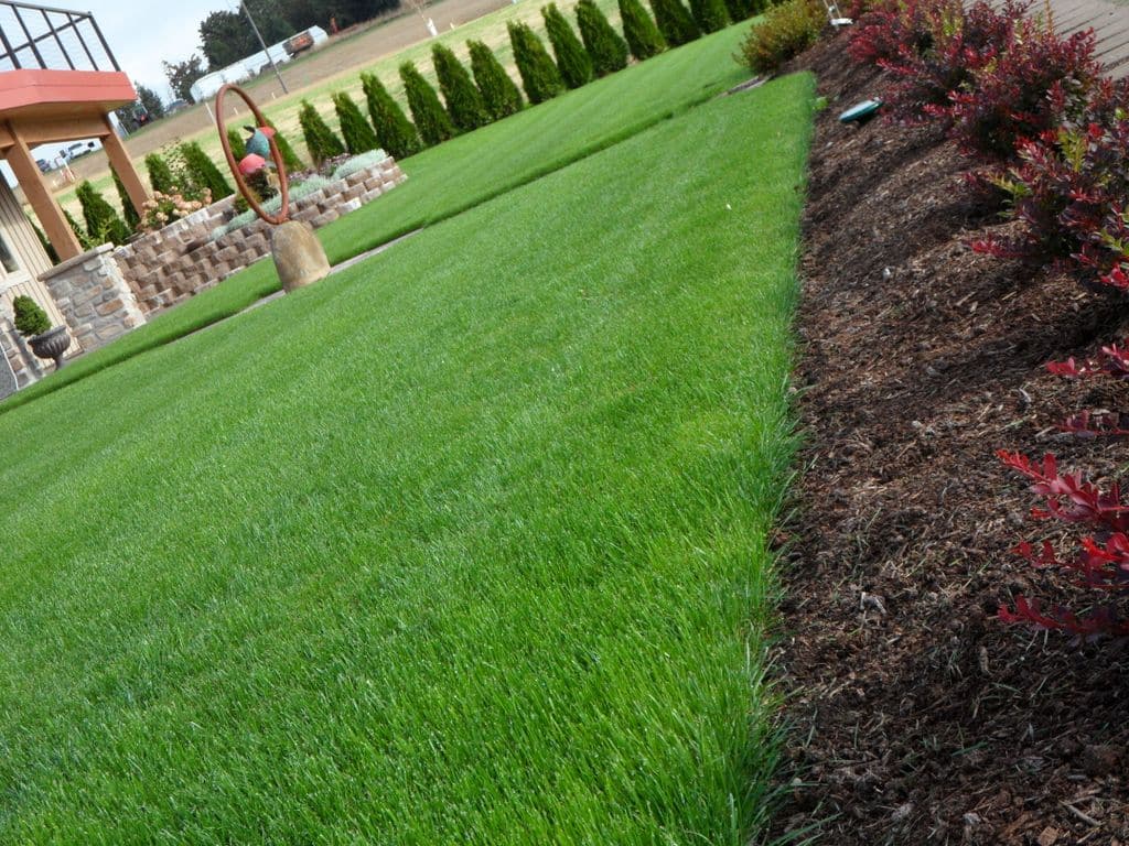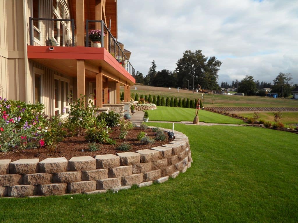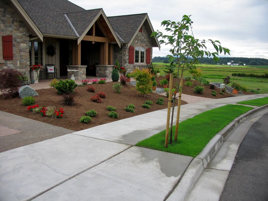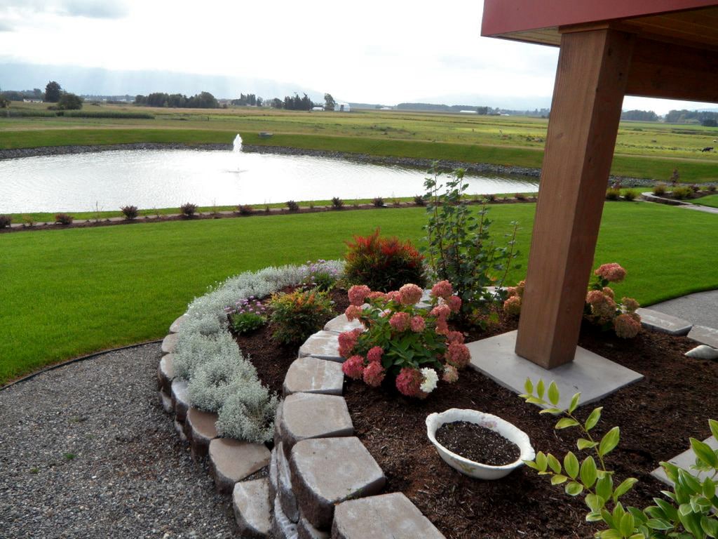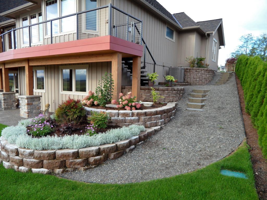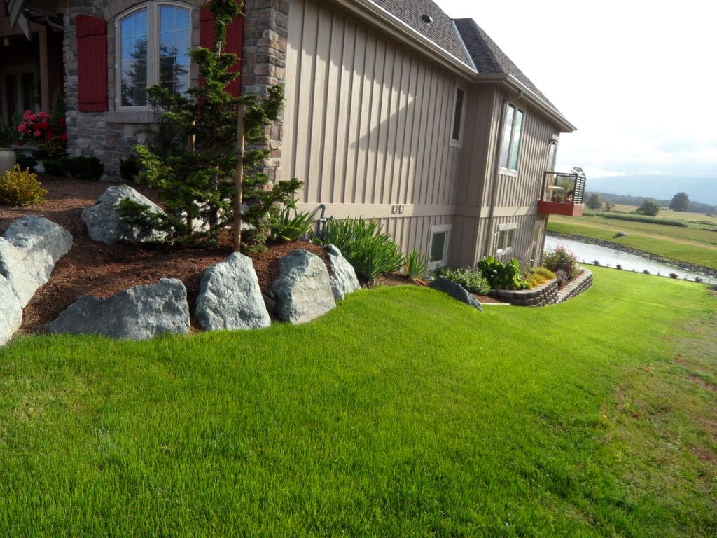 This custom built new construction has amazing views, and the owners wanted an attractive landscape to accompany their vista. The landscape was designed as more of an formal English garden, with some symmetry to the plants. Hardscapes were added in, as well as a section for some art the owner wanted to display. Irrigation was added for the lawn, and drip irrigation in all the gardens.