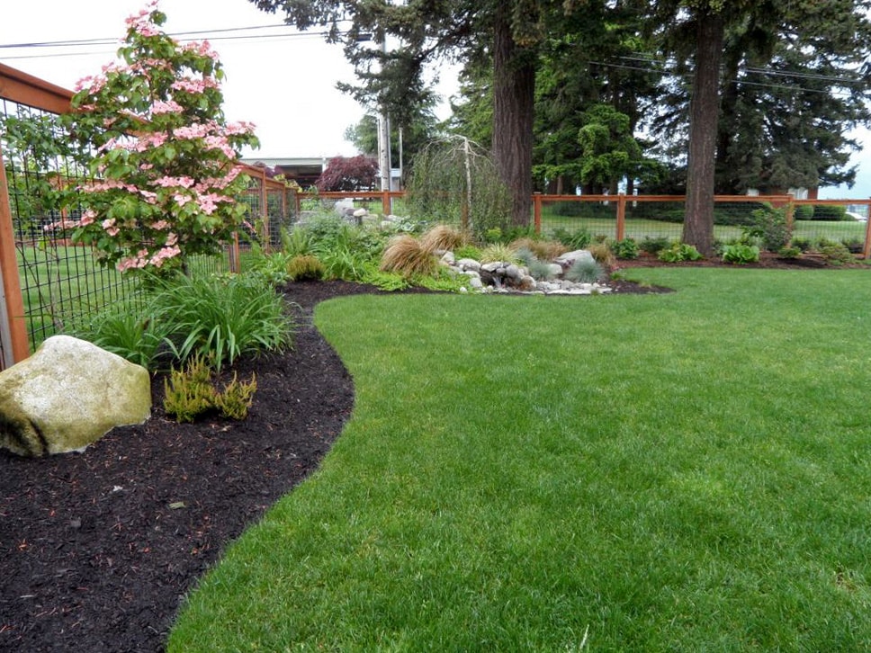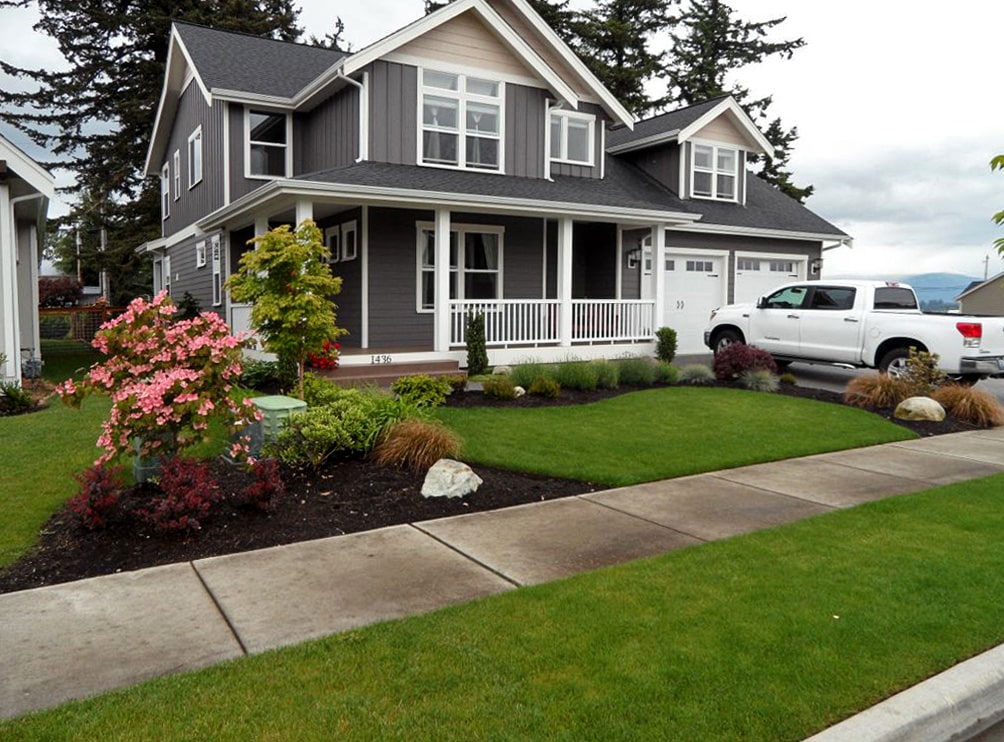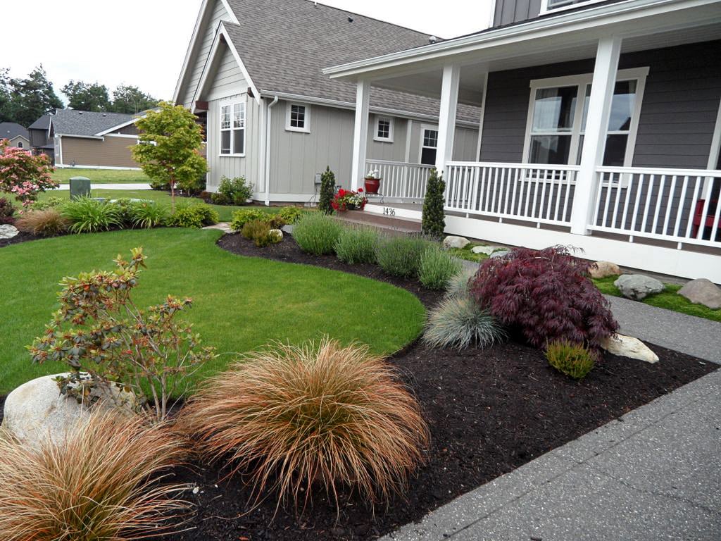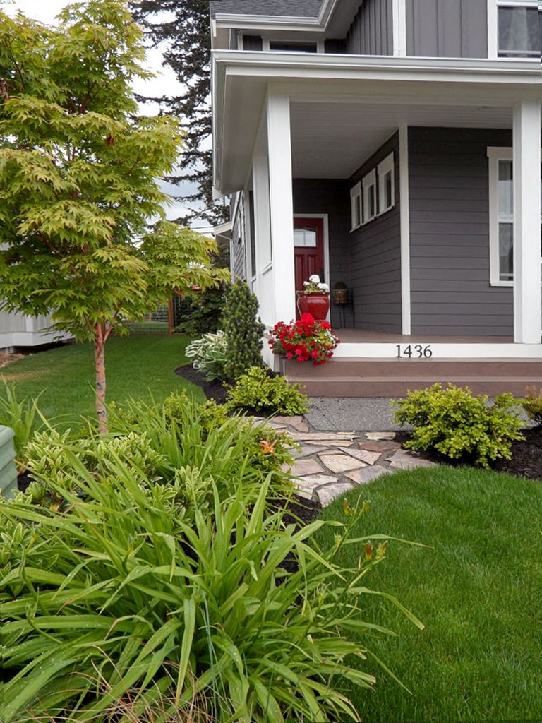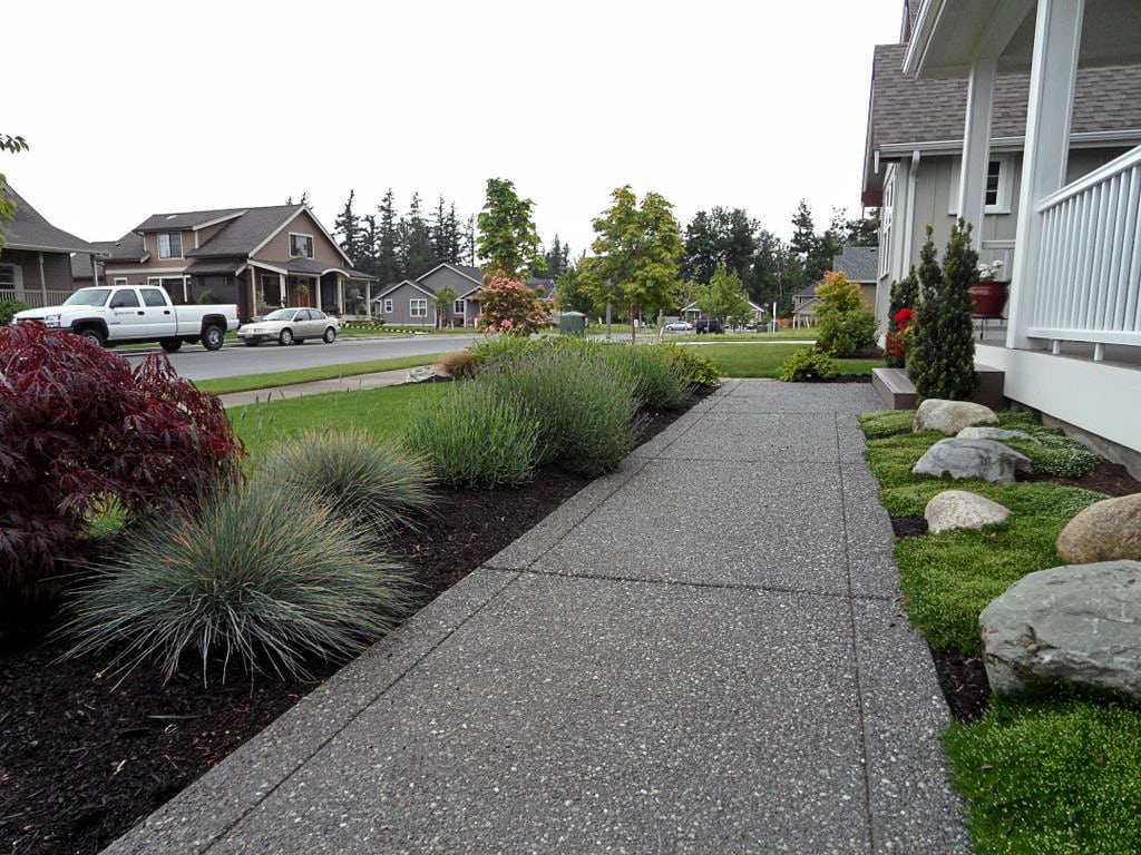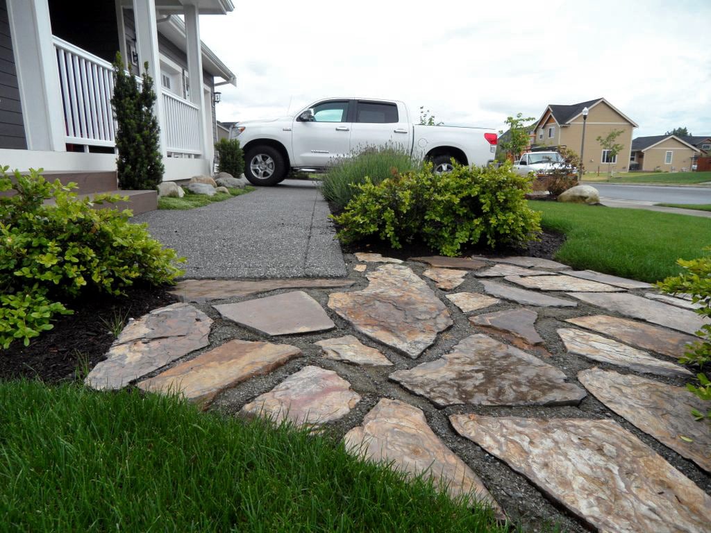 This new construction included a full landscape, including water feature, flagstone, sprinkler system, and many new plants. The owners wanted something interesting in front of their porch. So we designed a unique section with field stone rocks combined with Irish moss. This keeps spreading between the rocks, and appears as a boulders looming out of a field of green. The pondless water feature is all the fun of a waterfall without the danger of standing water (with young children) and low maintenance. The auto-fill valve always keep the water level topped off. With the weekly addition of beneficial bacteria, algae is kept at bay, and wildlife love it too!